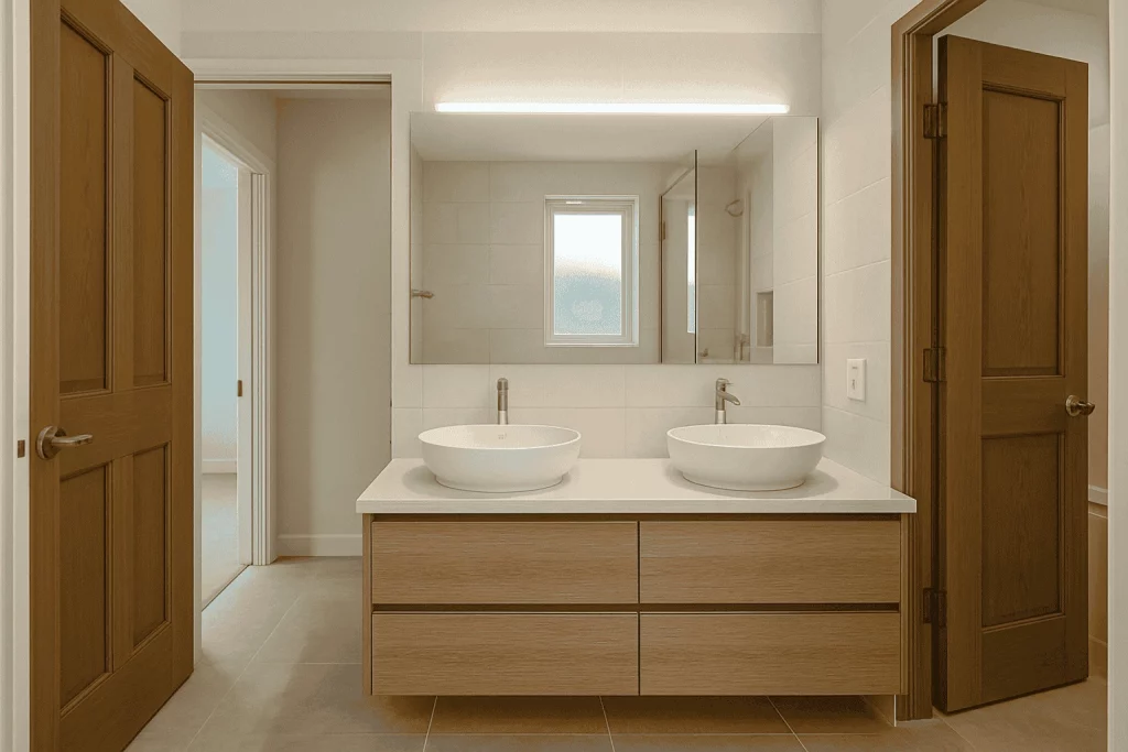 Na prática, a suíte canadense exige atenção a alguns detalhes para funcionar bem no cotidiano. O principal deles é a instalação de fechaduras internas nas portas, garantindo a privacidade de quem estiver usando o banheiro. Em casos de ligação entre sala e quarto, essa proteção é ainda mais importante, já que um dos acessos é voltado à área social.